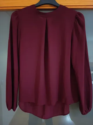 Blusa elegante com um tom vermelho profundo. - Decote discreto com pregas centrais. - Mangas compridas com elástico nos punhos. - Corte ligeiramente arredondado na bainha.