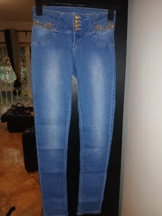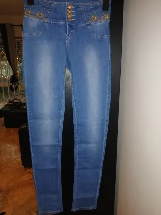 Calças de ganga com um design moderno e elegante. - Cintura alta com fecho de botões dourados. - Detalhes bordados na zona da cintura. - Corte justo e moderno. Diz tamanho L , mas na realidade e tamanho XS/S