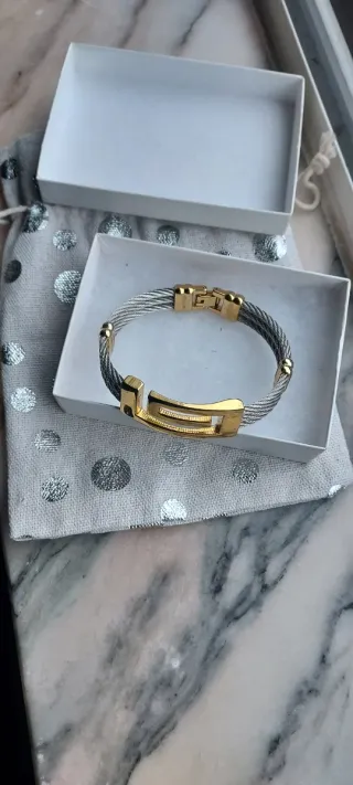 Pulseira elegante com um design moderno. - Combinação de fios prateados e detalhes dourados. - Fecho seguro e prático.