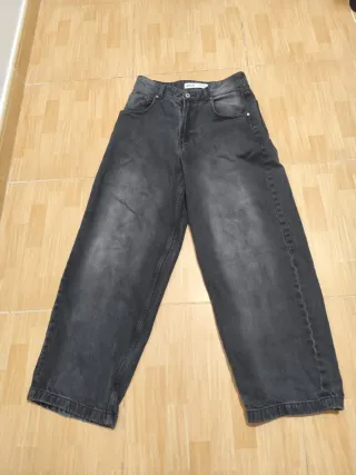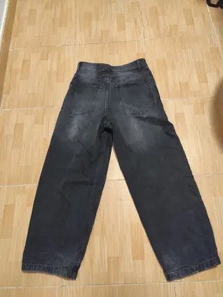 Calças jeans pretas de corte largo. - Cintura alta. - Lavagem desbotada. - Bolsos frontais e traseiros.