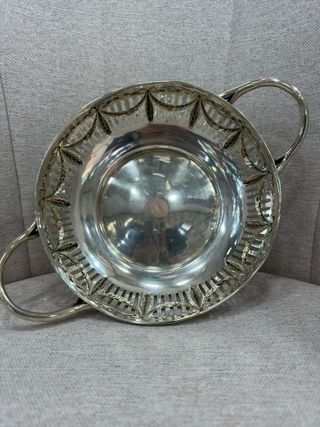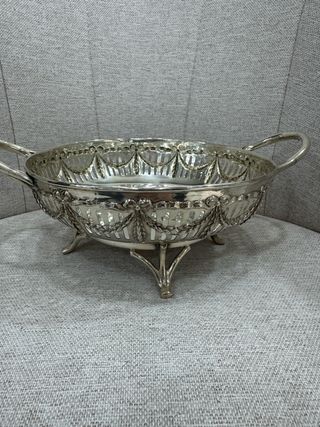 Elegante cesta em prata portuguesa com um design intrincado e alças laterais. Perfeita para decoração ou servir. - Material: Prata - Origem: Portuguesa - Detalhes: Trabalho em filigrana e alças - Design: Aberto e ornamentado Produzido na empresa Reis joalheiros no porto (portugal) Peca antiga de prata 833% Tag ouro relogio diamantes