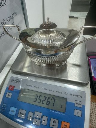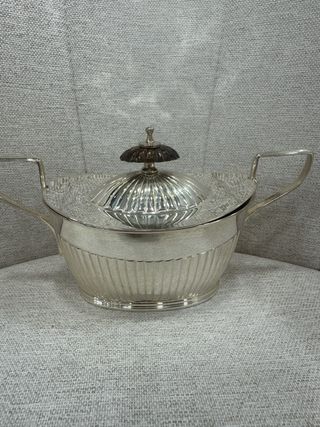 Elegante açucareiro em prata 925%. - Design clássico com alças laterais. - Tampa com pega decorativa. - Acabamento canelado na base e na tampa. Prata portuguesa de lei 925% Com aplicacao de madeira