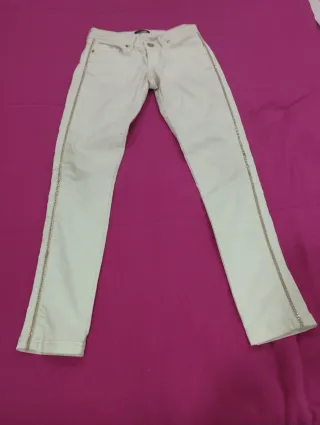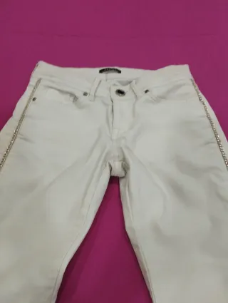 Calças Morgan de cor branca com um detalhe de corrente dourada nas laterais. Calças ensebadas e com elastano. - Detalhe de corrente dourada - Corte ajustado
