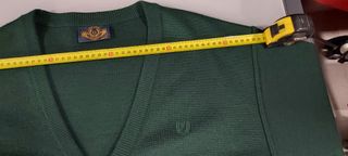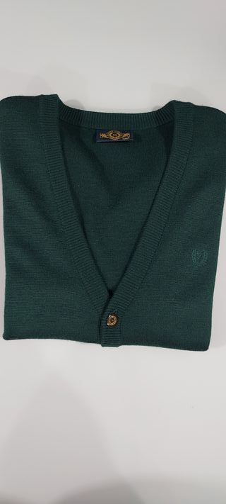 Casaco de malha clássico de excelente qualidade, com um tom verde profundo e elegante. - Gola em V. - Fecho com botões. - Detalhe de logo discreto no peito.