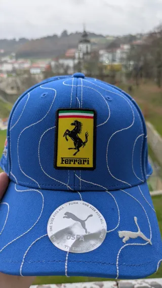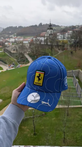 Boné da colaboração entre Puma e Ferrari, modelo Monza na cor azul. Presente prefeito para fãs de Formula 1! - Design com padrão de ondas brancas. - Patch bordado da Ferrari na frente. - Logo da Puma na lateral.
