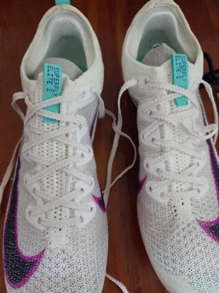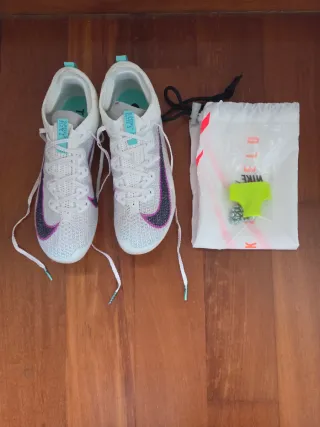 Sapatilhas de bicos Nike Superfly Elite 2. - Cor branca com detalhes em roxo e azul. - Inclui saco para transporte e espigões.