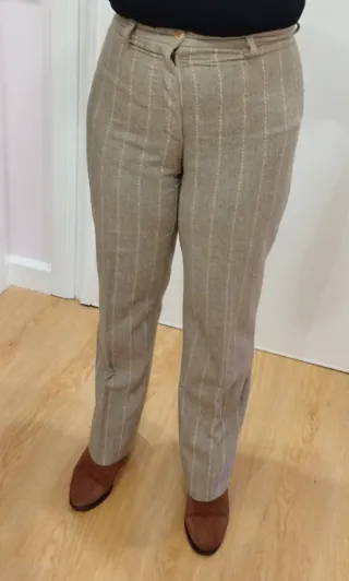 Calça clássica em tecido de lã. De cor bege com riscas finas. Um modelo elegante e versátil. - Tecido: Lã - Cor: Castanho com riscas - Tamanho: 36