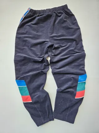 .Calças de fato de treino vintage Kappa, com aquele visual clássico e intemporal que nunca falha. Peça com acabamento em veludo no exterior, muito confortável ao toque e com um look retro autêntico, típico da Kappa dos anos 90 / early 2000s. O grande destaque vai para as laterais com a icónica fita Kappa repetida, combinada com painéis geométricos em azul, verde e vermelho, que dão um estilo desportivo forte e cheio de personalidade. 🔹 Detalhes: Marca: Kappa Material exterior: veludo Cintura elástica Design vintage com fita Kappa lateral Corte confortável, perfeito para streetwear ou sporty vintage fits 📌 Estado: Apresenta