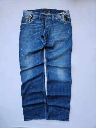 Calças de ganga TAKESHY KUROSAWA, uma peça statement de denim artístico, feita à mão em Itália e pensada para quem gosta de moda fora do comum. Este modelo destaca-se pelo seu patchwork único com inspiração rock, gótica e xadrez, transformando a ganga numa verdadeira obra de arte vestível. 🔥 Detalhes de destaque: Marca: TAKESHY KUROSAWA Hand Made in Italy State of the Art Denim Material: 100% Cotton Tamanho indicado: 34 Denim premium italiano, robusto e de elevada qualidade ♟️ Design & Aplicações: Iniciais “TK” aplicadas no bolso traseiro com tachas metálicas Patchwork frontal com temática xadrez / caveiras: Cavalo de