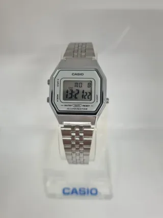 Relógio Casio digital com bracelete em metal prateado e mostrador branco. - Bracelete em aço inoxidável. - Função de alarme. - Cronômetro integrado. - Resistente à água.