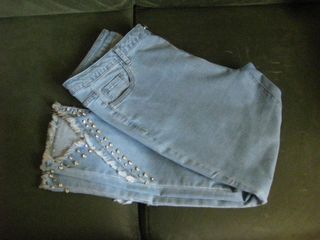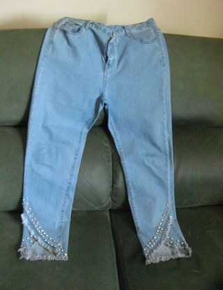 Calças de ganga justas com um toque especial na bainha. - Bainha desfiada com aplicação de brilhantes. - Design moderno e elegante.