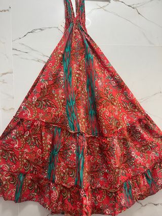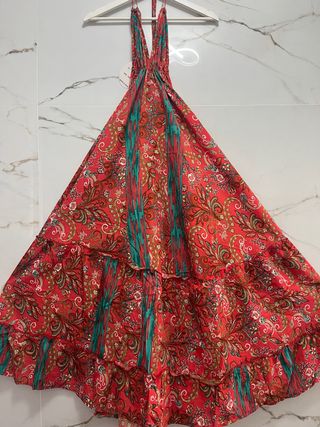 Vestido longo com um estampado vibrante e fluido, perfeito para um look descontraído. - Design boho. - Estampado paisley. - Decote halter.