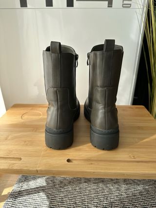 Botas de cano médio em tom bege, com um design moderno e prático. Tamanho 38 mas calcça 39 também - Fecho lateral com fecho de correr. - Atacadores frontais para ajuste. - Detalhe de fivela dourada na lateral. - Sola grossa e robusta.