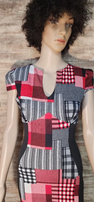 Vestido de verão com um design patchwork vibrante e moderno. Perfeito para dias quentes. - Estampa geométrica e xadrez. - Mangas curtas. - Comprimento até o joelho.