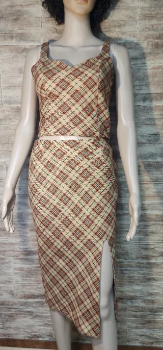 Conjunto de top e saia com padrão xadrez. - Top com alças. - Saia com fenda lateral.