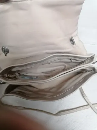 Carteira elegante em tom bege, com um design moderno e prático. - Compartimento principal com fecho de correr. - Bolso interior com fecho de correr. - Alça de ombro em corrente e pele.