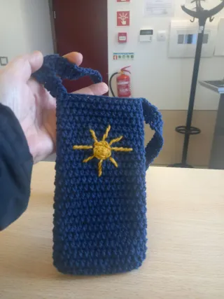 Bolsinha feita à mão, perfeita para o seu telemóvel. O design inclui um sol amarelo bordado. - Feita em croché. - Cor principal azul. - Detalhe de sol amarelo.