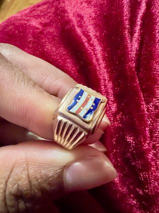Anel em ouro com detalhes em esmalte. - Design com bandeira. - Detalhes em azul, branco e vermelho.