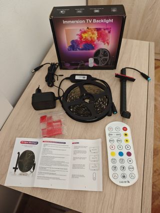 Kit de iluminação LED para criar uma experiência imersiva na sua TV. Inclui fita LED, fonte de alimentação e controle remoto. - Fita LED para retroiluminação de TV. - Controle remoto RF 2.4G para ajustes. - Inclui clipes de fixação.