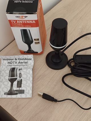 Antena digital para TV, portátil e versátil. - Suporta 4K e 1080p. - Design moderno e compacto. - Ideal para uso interno e externo.