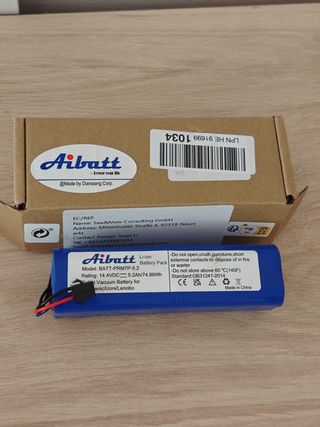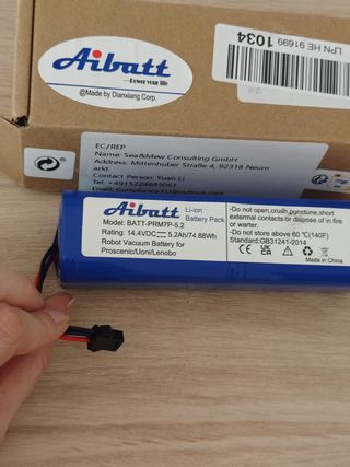 Bateria de Li-ion Aibatt para aspirador robot. - Modelo: BATT-PRM7P-5.2 - Capacidade: 5.2Ah / 74.88Wh - Voltagem: 14.4VDC - Compatível com Proscenic/Uoni/Lenovo - Fabricado na China