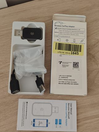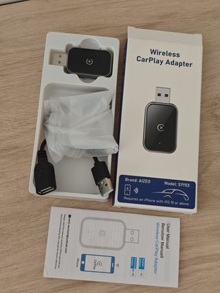 Adaptador para transformar o seu sistema de infotainment em CarPlay sem fios. Compatível com iPhone com iOS 10 ou superior. - Marca: AIZEO - Modelo: SYY03 - Inclui cabos e manual de instruções. Honestamente nao sei como funciona.
