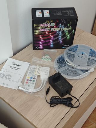 Conjunto de fitas LED 5050 Smart da Ltteny, ideal para iluminação decorativa. Inclui dois rolos de 10 metros cada. - Fitas LED 5050 Smart. - 2 rolos de 10 metros (total 20 metros). - Inclui controlo remoto e fonte de alimentação. - Fitas adesivas para fixação. informaçoes nas imagens.