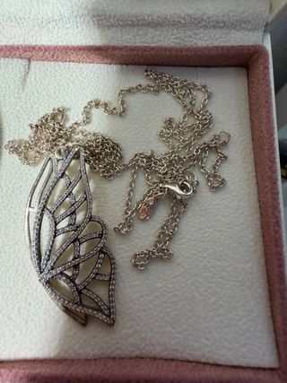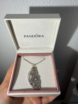 Colar da Pandora com um pingente em forma de asa de borboleta. - Design detalhado com pequenas pedras. - Corrente fina e delicada.