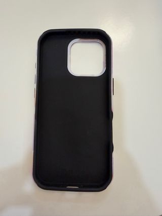 Capa para iPhone 16 Pro com um design moderno e colorido. - Padrão abstrato em tons de roxo, rosa e laranja. - Acabamento liso e brilhante.