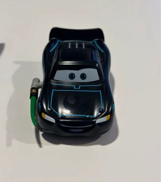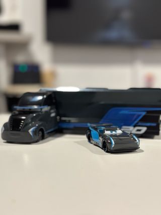 Conjunto de brinquedos do filme Cars, com o camião e o carro Jackson Storm, completamente novo - Camiao preto com detalhes azuis. - Carro de corrida Jackson Storm preto e azul.