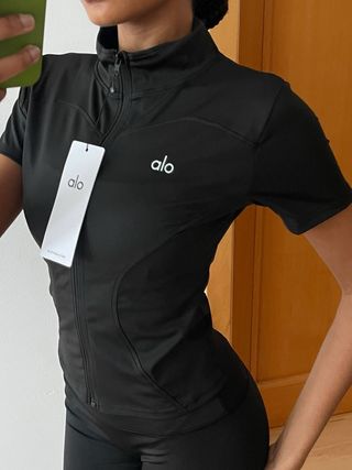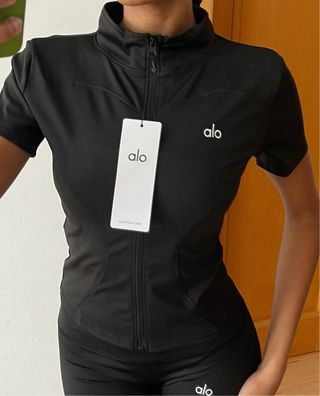 Camisa Alo yoga preta, com zíper frontal e gola alta. Peça nova com etiqueta. - Manga curta. 📦 Envío rápido 🏷️ Preço negociável Entra no nosso perfil e faz conjuntos assim poupas no envío!