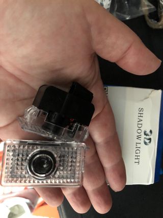 Conjunto de luzes de projeção 3D para carro, também conhecidas como luzes de sombra. - Design em acrílico transparente. - Parte superior em plástico preto com conector. - Padrão de grade na lente.