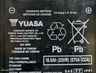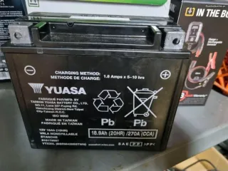 Bateria Yuasa YTX20L de 12V e 18Ah (10HR) / 18.9Ah (20HR). - Modelo: YTX20L (BBRM420BSTWN) - Voltagem: 12V - Capacidade: 18Ah (10HR) / 270A (CCA) - VRLA Nonsplillable (Etanché) - Fabricada em Taiwan - Método de carga: 1.8 Amps x 5-10 hrs