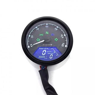 Conta quilómetro digital Conta rotações, indicador de mudança, piscas, médios e máximos. Tensão de funcionamento: 8-18v Voltagem: dc 12v Display digital de velocidade: 0-199 km/h Conta rotações RPM analógico: 0-12000rpm Mostrador digital de distância percorrida: 0-99999.9 km Indicador de mudança engatada: 1-6 Luz de fundo: Azul Diâmetro: 9cm Altura: 5.3cm Novo nunca usado Podera ser usado em diferentes marcas e modelos - cafeRacer