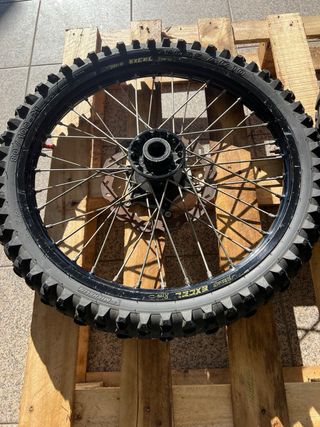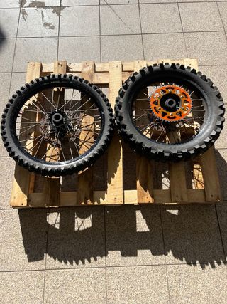 Conjunto de rodas para moto de enduro. - Roda dianteira com aro preto. - Roda traseira com aro preto e cremalheira laranja. Pouco usadas sem rachadelas. Roda 18/21
