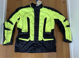 Casaco de mota Texpeed em preto e amarelo de alta visibilidade. - Design moderno com detalhes em amarelo. - Fecho frontal com botões. - Bolsos frontais com fecho. - Cinto ajustável na cintura.