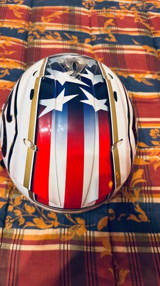 Capacete de moto ARAI RX-7 Corsair Cor principal branca com detalhes em preto, dourado e vermelho, bandeira Americana DETALHES DO PRODUTO Shell fabricado através do processo Super CLC Interior totalmente amovível e lavável Tecido interior Dry Cool resistente a protuberâncias - Frio ao contacto Tela Pinlock Sistema de ventilação com difusor superior Sistema de exaustão de ar lateral FFS Sistema de remoção de visor de alavanca Sistema anti embaciamento Interior removível e lavável Peso 2000g