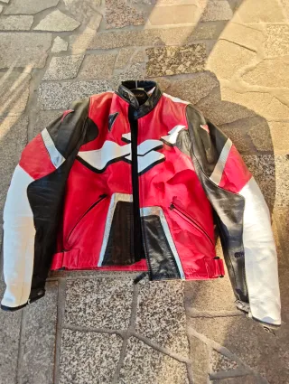 Fato de motociclismo Dainese em pele e tecido. Casaco 50 Calças 52 - Combinação de cores vermelha, preta e branca. - Detalhes em material refletor prateado. - Gola alta com fecho. - Fecho frontal completo. - Bolsos com fecho. - Ajustes na cintura.
