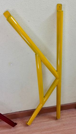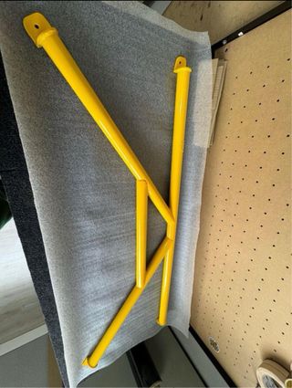 Barra de segurança em metal amarelo. - Peça de metal pintada em amarelo. - Estrutura tubular com suportes. - Design em forma de Y com reforços. # Ultima foto é exemplo