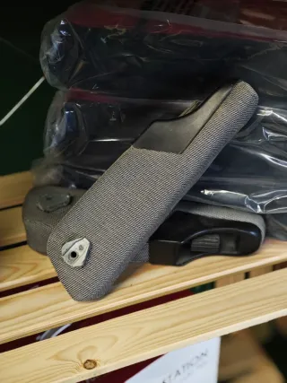 Conjunto de apoios de braço para Volkswagen T4. - Revestimento em tecido cinza. - Detalhes em preto. - Peças de fixação visíveis.