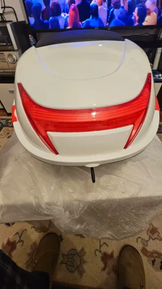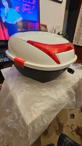 Top case branca e preta, nova por estrear, ainda embalada. Grande capacidade — ideal para capacete, compras ou mochila. Refletor traseiro vermelho para maior segurança. Inclui base de fixação universal e chave. Compatível com a maioria das scooters e motos. Excelente oportunidade!