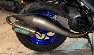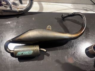 Escape Proma para Honda Dio. Fabricado en metal con detalles en fibra de carbono en el silenciador. af16/af18/af28 - Diseño deportivo. - Marca Proma visible en el escape y silenciador.