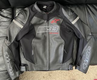 Casaco de mota Alpinestars, edição especial Marc Márquez. - Design em pele preta e cinza. - Detalhes com o logo MM93. - Logos Alpinestars nas mangas. Usado apenas 3 vezes sendo uma delas no exame de condução, o casaco fica-me apertado.