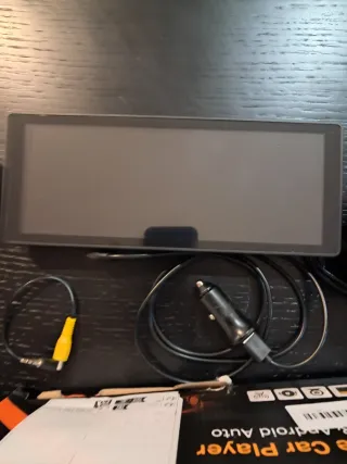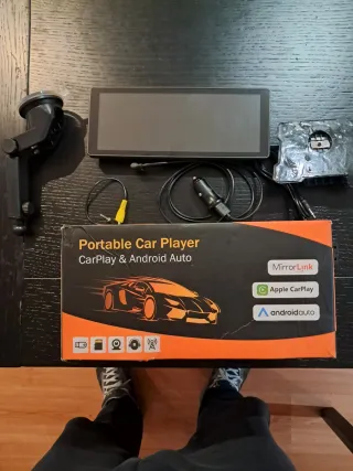 Este é um reprodutor de carro portátil com suporte para Apple CarPlay e Android Auto. - Compatível com MirrorLink. - Inclui suporte de ventosa. - Carregador para isqueiro incluído.