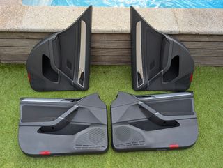 Conjunto de 4 forras de porta para Volkswagen Golf MK7/ 7.5. As peças apresentam-se em bom estado, na cor preta, com detalhes em prata. A porta do condutor apresenta alguns riscos na zona prateada. As restantes estão em ótimo estado. Seguem com os comandos de controlo dos vidros incluídos. - 4 forras (2 dianteiras e 2 traseiras); - Aplique prata da zona do porta-luvas