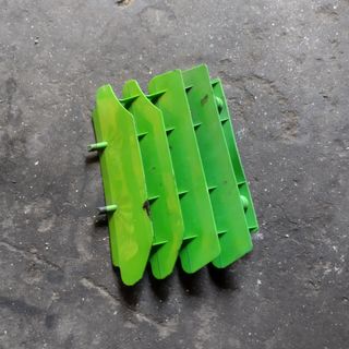 Protetor de radiador direito usado para moto KLX 650, na cor verde. Apresenta alguns sinais de uso.