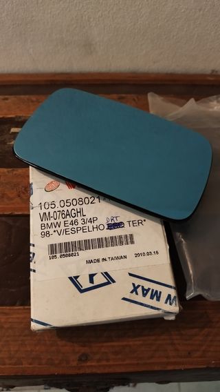 Cristal de espelho retrovisor para BMW E46. Novo, embalado ASFÉRICO TÉRMICO AZUL - Lado esquerdo. - Fabricado em Taiwan. - Data de fabrico: 2010.03.15.