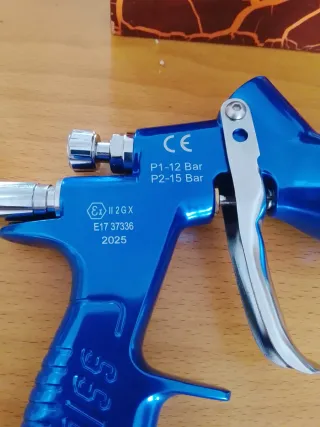 Pistola de pintura profissional para uso automóvel. Possui um acabamento azul metálico com detalhes gravados. - Copo superior branco. - Design ergonómico para conforto. - Marca: DeVidiss