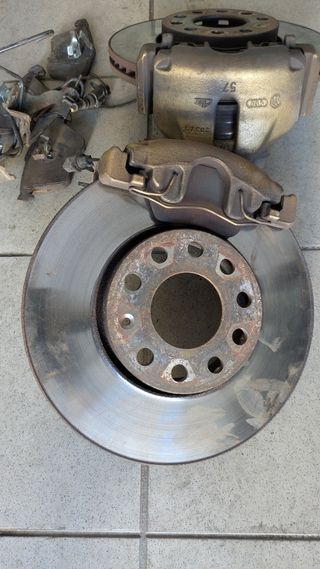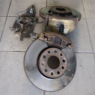 Conjunto de discos e pinças de travão frontais para Audi A4 B6 B7. - Discos de travão em bom estado. - Material de travão incluído como está nas fotos. - Para aplicação em Audi A4 B6/B7 ou adaptação noutros modelos.