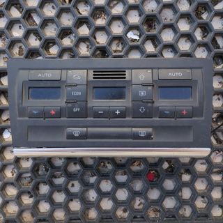Painel de climatização Climatronic para Audi A4 8E B6 B7. Inclui botões para bancos aquecidos. - Controlo de temperatura digital. - Função AUTO e ECON. - Controlo de ventilação e distribuição de ar. - Ligeiro desgaste no display do meio, facilmente substituível, de resto tudo impecável. Possível substituição do display: acresce 20€.